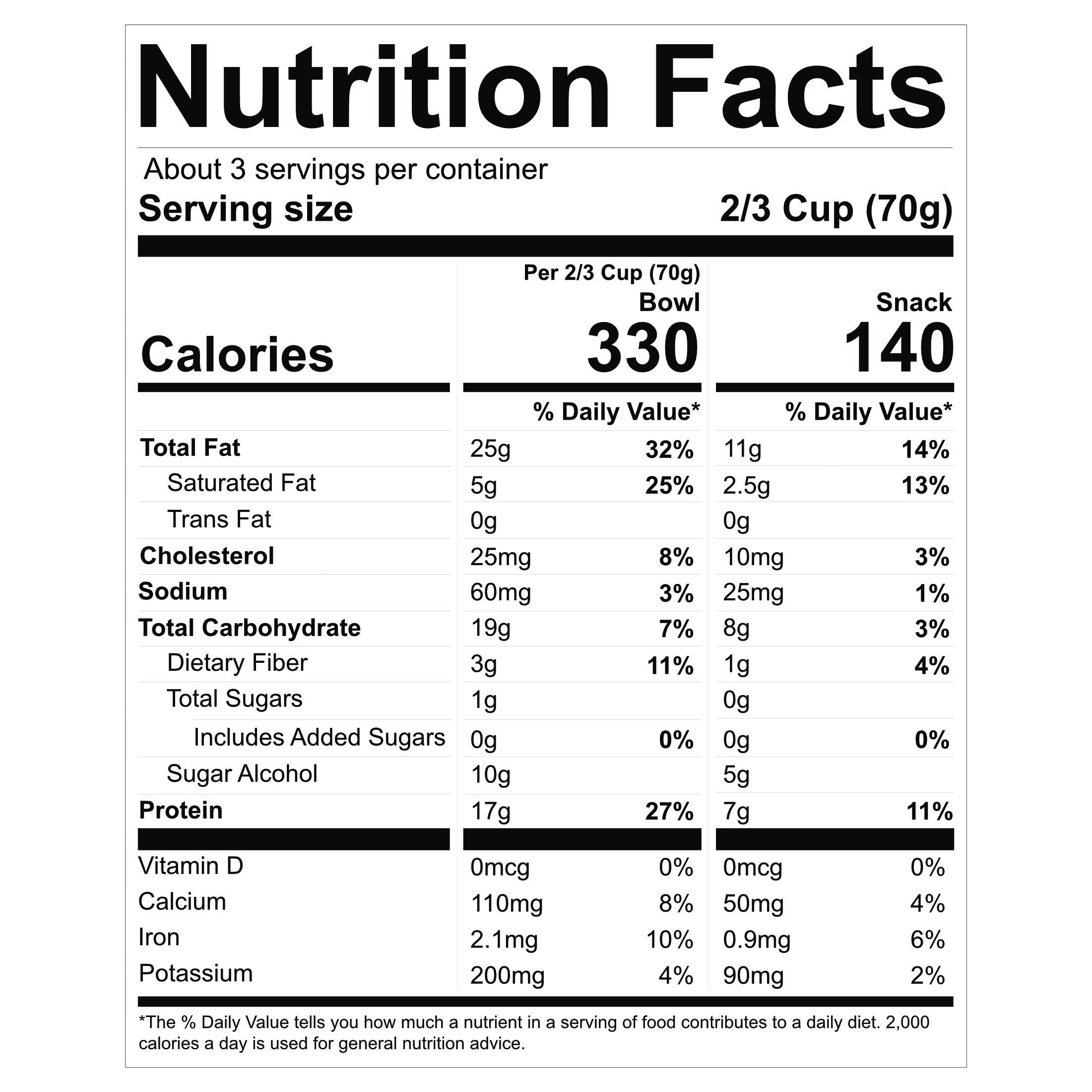 Ingredients: Sunflower seeds, Pumpkin seeds, erythritol, whey protein crisps (whey protein concentrate, tapioca starch), almonds, pecans, butter (pasturized cream, natural flavor), whey protein concentrate, natural flavors, salt, monkfruit extract