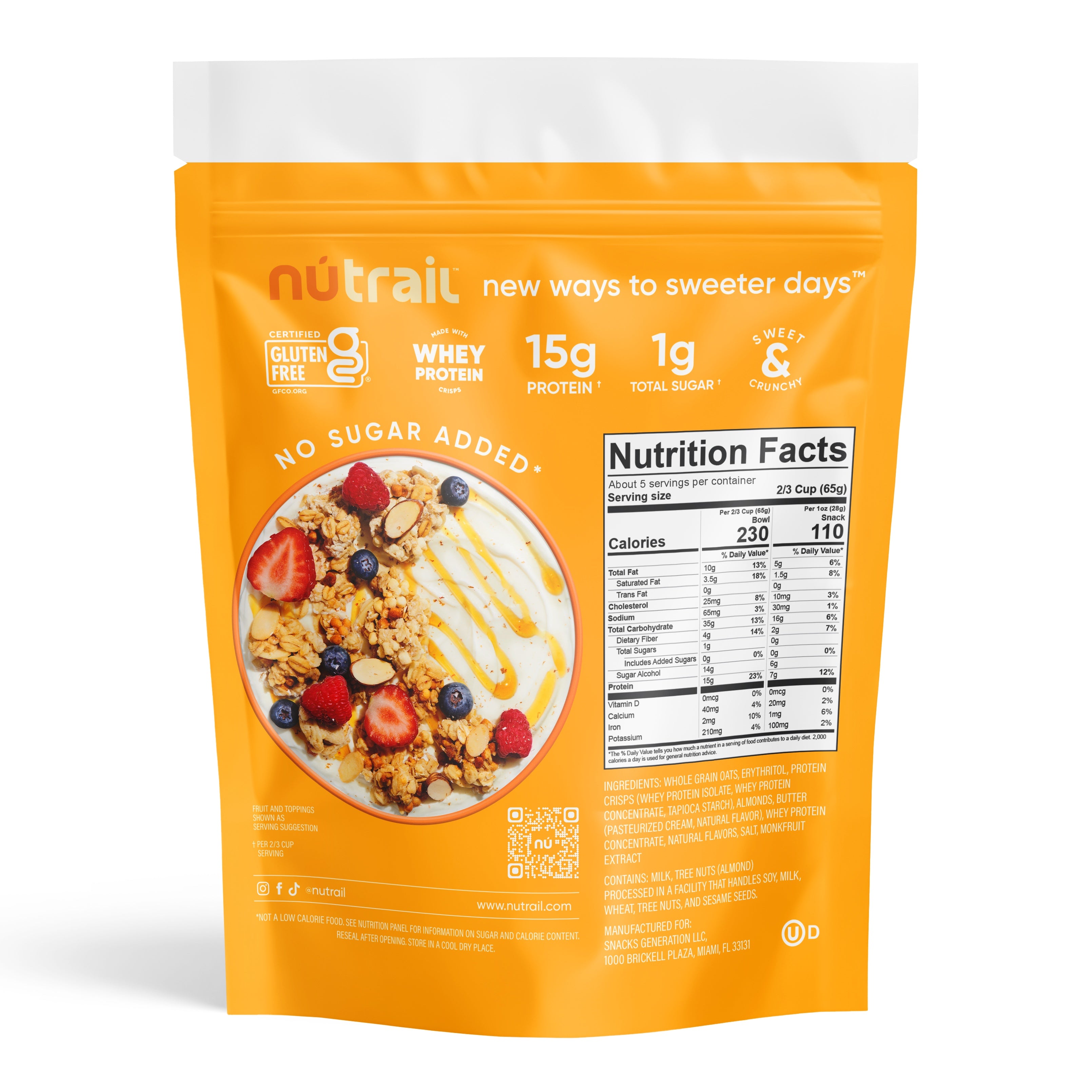 Our Honey & Oats Protein Oat Granola - No Sugar Added - takes to our Nut Granola to the next level with added essential protein crisps. Packed with 15g of protein and 1g sugar, this granola offers the invigorating flavor, crunch, and lasting energy you’re looking for. You can take this on-the-go to fuel up between meals, have it as breakfast with a bowl of your preferred milk, or use it to dress up your favorite dessert. This 8oz bag of wholesome nutrition is perfect for adventuring, relaxing, recharging, or just straight-up indulging. At NuTrail, we love meticulously crafting the best high-quality, low-sugar experiences for you. Treat yourself to a nourishing treat – you deserve it!